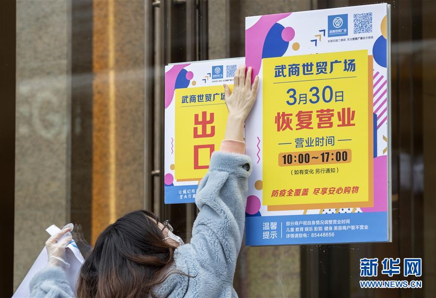 3月30日,在武商世貿廣場,工作人員在開門前布置標志牌。當日,武漢市多家商場開門迎客。新華社記者費茂華攝