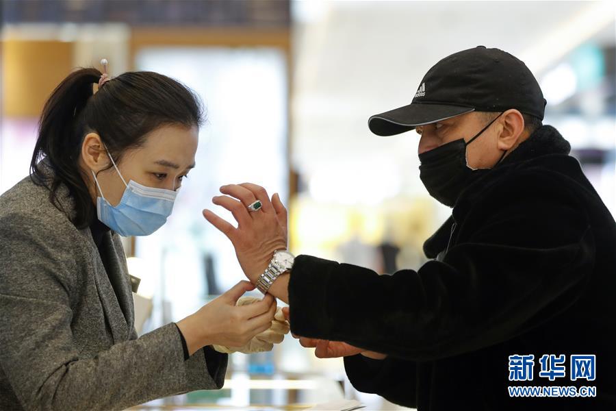 3月30日,在武漢市武商世貿廣場,一名顧客(右)在挑選手表。當日,武漢市多家商場開門迎客。新華社記者沈伯韓攝
