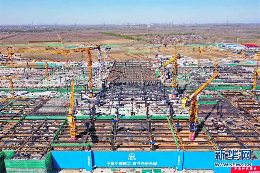 這是3月27日拍攝的京雄城際鐵路雄安站施工現場(無人機照片)。新華社記者楊世堯攝