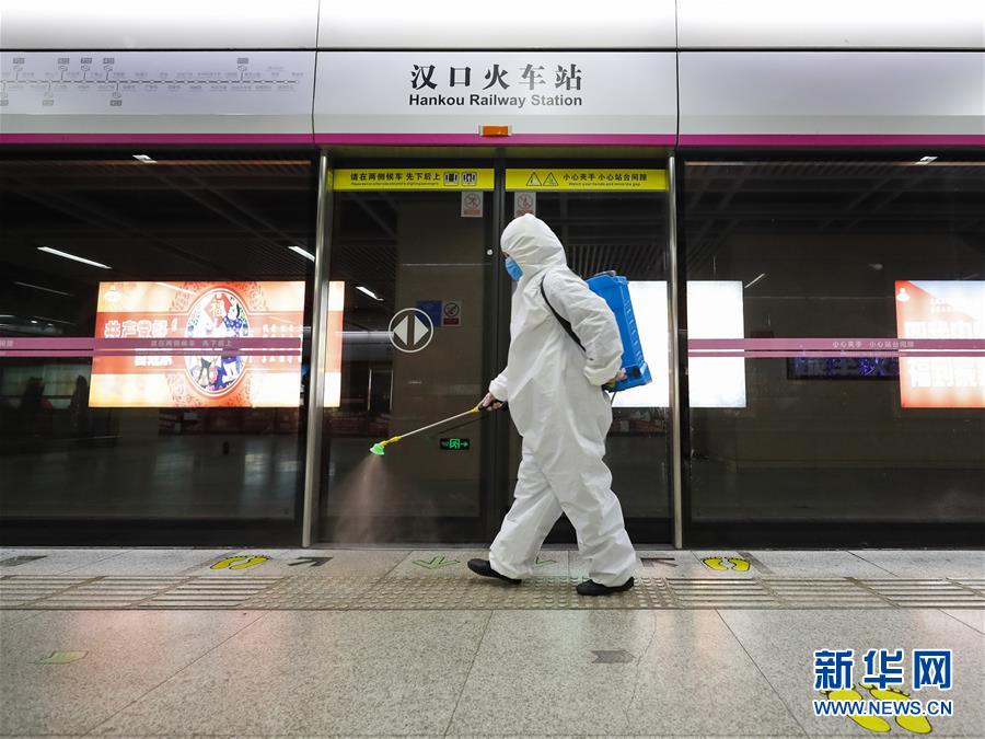 3月23日,在漢口火車站地鐵站,保潔人員在為站臺消毒。新華社記者沈伯韓攝