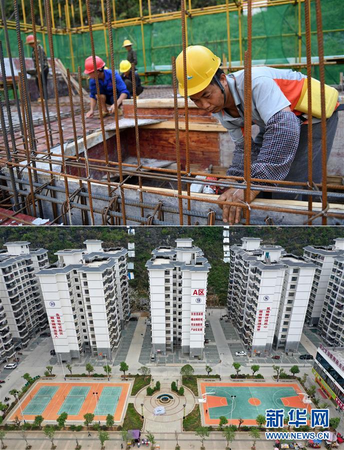 拼版照片:上圖為工人在廣西都安瑤族自治縣八仙易地扶貧搬遷安置新區項目施工(2016年7月25日攝);下圖為已經建成入住的廣西都安瑤族自治縣八仙易地扶貧搬遷安置新區部分樓房(無人機照片,2019年10月16日攝)。新華社記者陸波岸攝