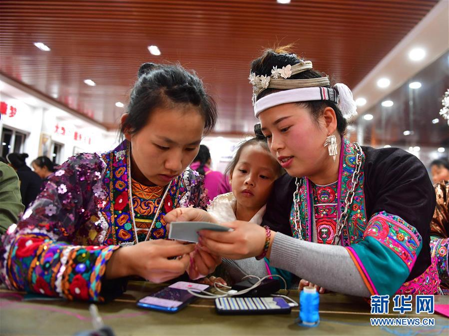 村民在廣西融水苗族自治縣易地扶貧安置點苗家小鎮“婦女之家巾幗扶貧車間”學習刺繡(2019年11月18日攝)。新華社記者黃孝邦攝