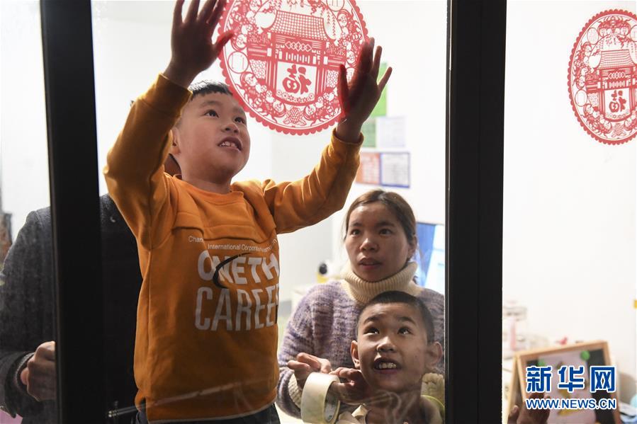 廣西興業縣搬遷群眾胡紅君(后右)的兒子在新居內貼窗花(2020年1月20日攝)。新華社記者曹祎銘攝