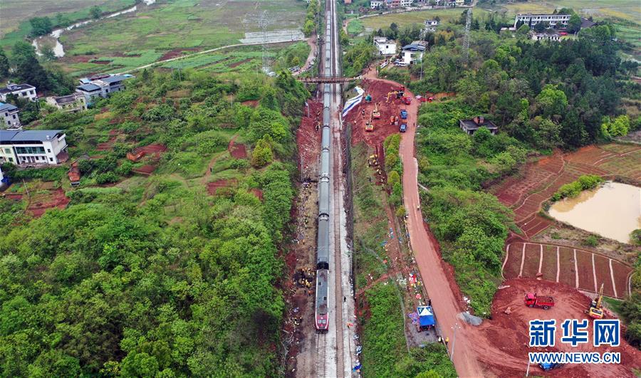 4月1日,Z201次旅客列車通過京廣鐵路郴州段脫軌事故區段(無人機照片)。新華社記者李尕攝