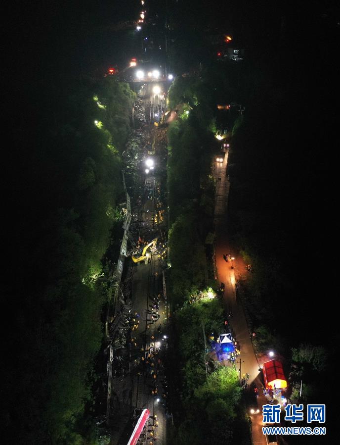 3月31日,工程車輛在T179次客運列車脫軌現場作業(無人機照片)。新華社發(陳振海攝)