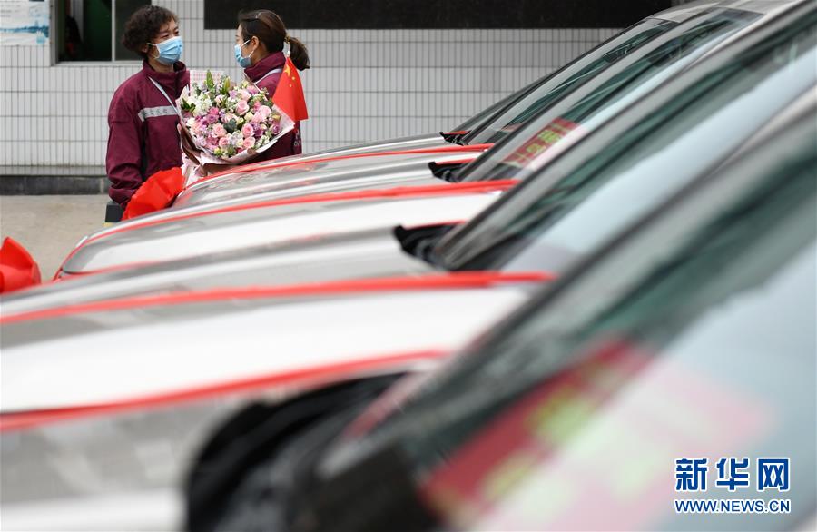 4月3日,兩名陜西醫療隊隊員在離別前交談。 當日,陜西省第一批援鄂醫療隊137名隊員在陜西省工人療養院結束了為期兩周的隔離休養。醫療隊員與“戰友”深情作別后,陸續踏上歸途。 新華社記者 李一博 攝