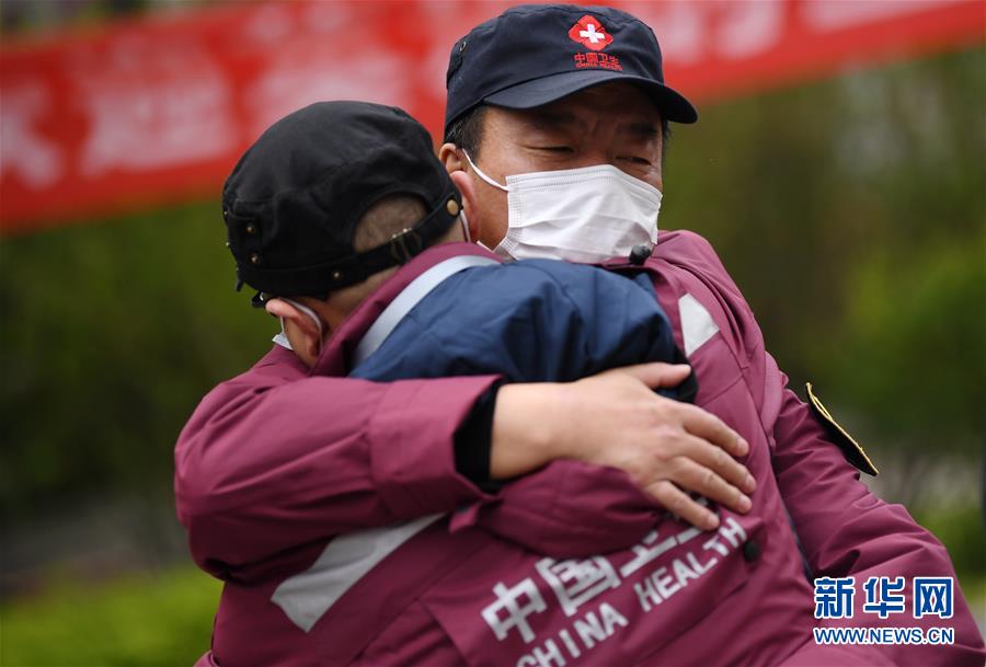 4月3日,陜西省第一批援鄂醫療隊隊長易智(右)和隊員擁抱作別。 當日,陜西省第一批援鄂醫療隊137名隊員在陜西省工人療養院結束了為期兩周的隔離休養。醫療隊員與“戰友”深情作別后,陸續踏上歸途。 新華社記者 李一博 攝