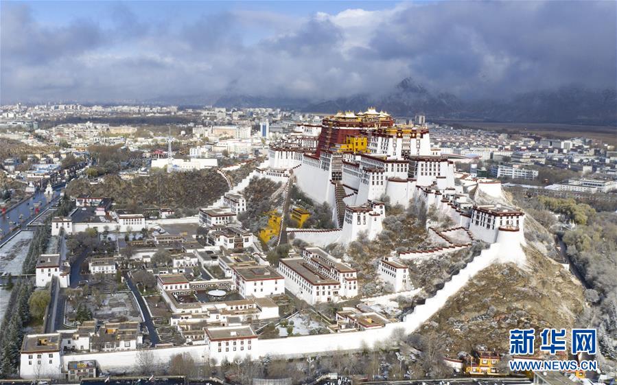 4月5日拍攝的布達拉宮雪景(無人機照片)。新華社記者普布扎西攝