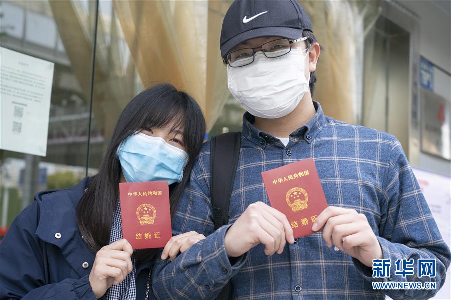 4月7日,在武漢市江岸區民政局婚姻登記處,陳先生與張女士展示結婚證。4月3日起,武漢市婚姻登記機構陸續恢復辦理婚姻登記業務。婚姻當事人需持綠色健康碼預約登記,分批分時辦理。  新華社記者才揚攝