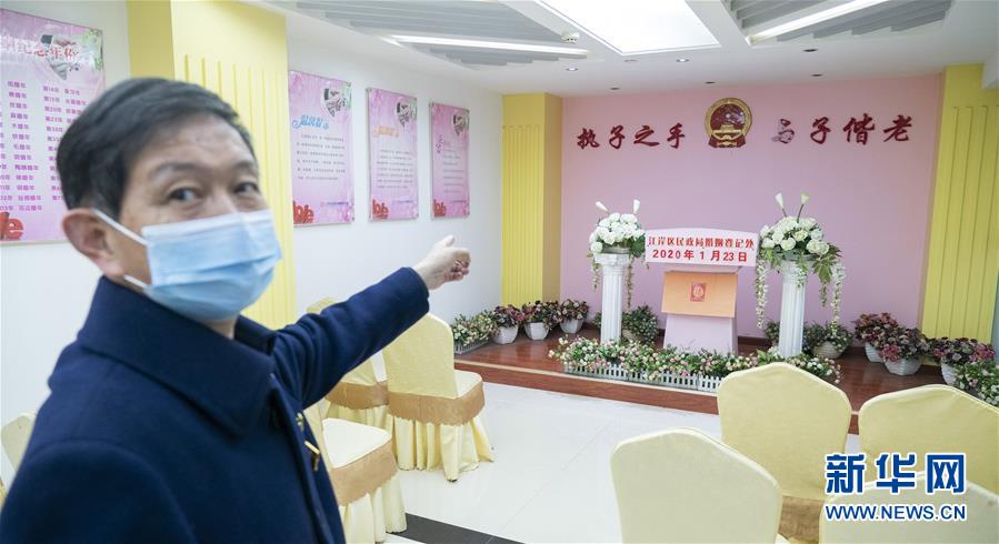 4月7日,武漢市江岸區民政局婚姻登記處工作人員介紹頒證廳,疫情期間這里暫停使用。 新華社記者才揚攝
