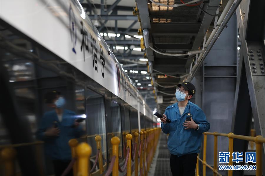 4月7日,武漢動車段運用車間綜合檢修班工長楊磊在檢查車輛情況。 新華社記者 沈伯韓 攝