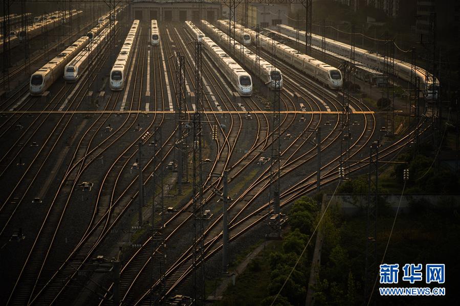 4月8日,在武漢動車段,列車停靠在存車線上準備投入運行。 新華社記者 肖藝九 攝