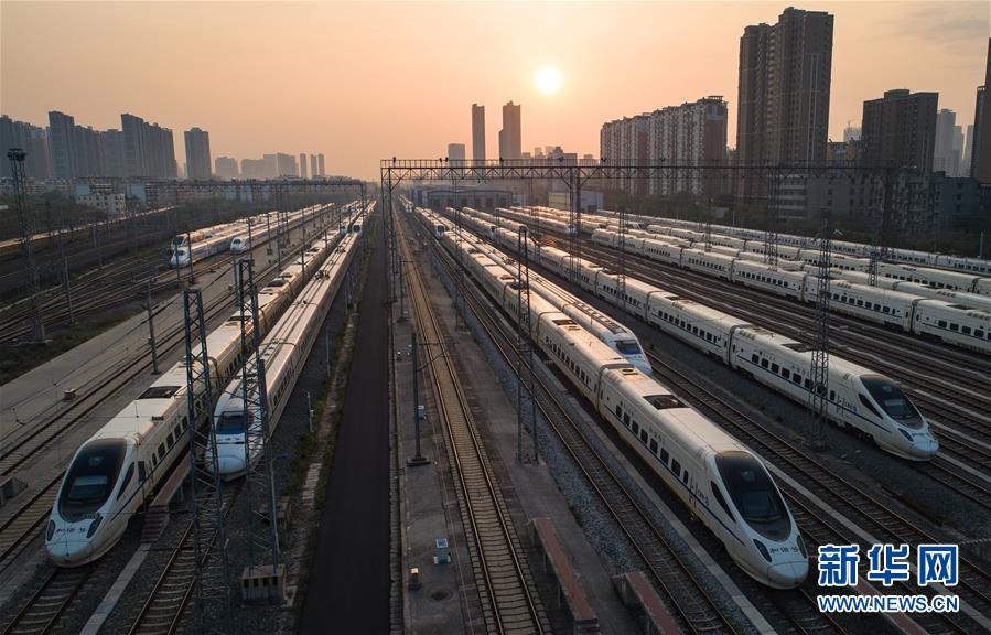 4月8日,在武漢動車段,列車停靠在存車線上準備投入運行(無人機照片)。 新華社記者 肖藝九 攝