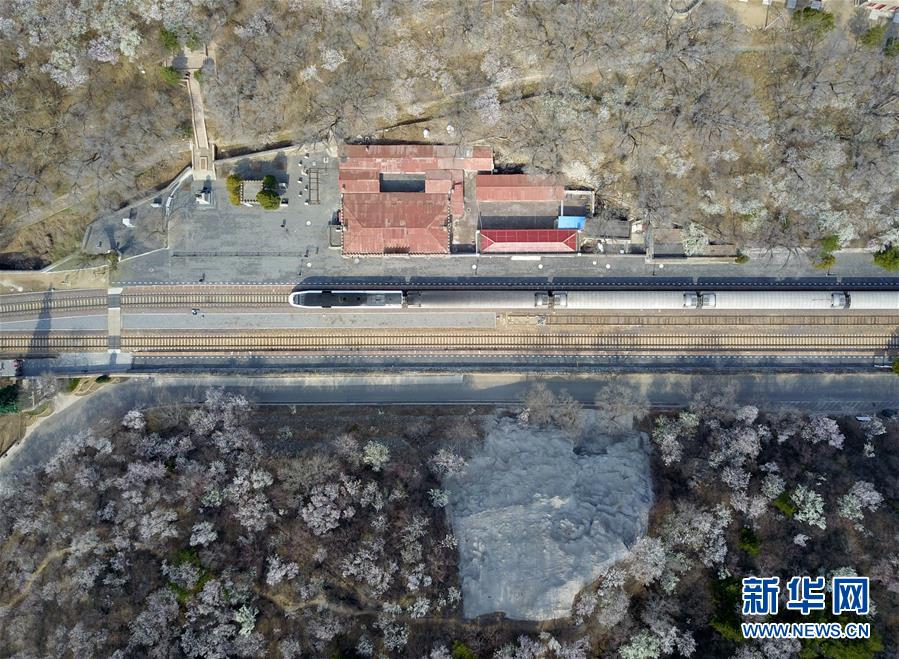 4月8日,北京青龍橋火車站附近春花盛開(無人機照片)。 新華社記者張晨霖攝