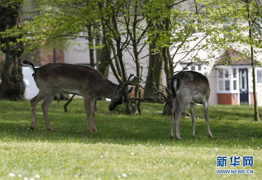 4月8日,在英國倫敦東部一個居民區,附近公園里的鹿在草坪上駐足。隨著新冠疫情在英國的擴散,政府要求人們減少不必要的外出。倫敦東部一個居民區附近公園里原來散養的鹿紛紛從公園走出來,或吃草或接受附近居民的喂食,成為特殊時期居民區里的新“客人”。新華社記者韓巖攝