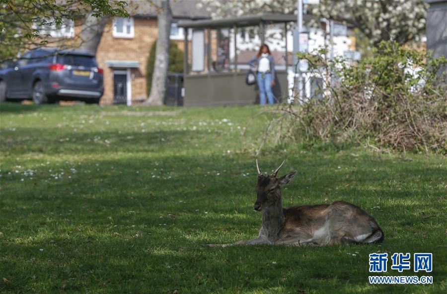 4月8日,在英國倫敦東部一個居民區,附近公園里的鹿在草坪上休息。隨著新冠疫情在英國的擴散,政府要求人們減少不必要的外出。倫敦東部一個居民區附近公園里原來散養的鹿紛紛從公園走出來,或吃草或接受附近居民的喂食,成為特殊時期居民區里的新“客人”。新華社記者韓巖攝