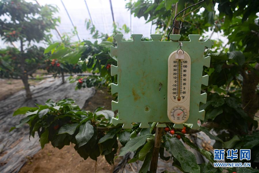 這是4月15日在特克斯礪劍鋒農(nóng)林科技有限公司赤谷新城休閑觀光農(nóng)業(yè)示范園拍攝的反季節(jié)大櫻桃大棚內(nèi)的溫濕度計(jì)。大棚采用自動(dòng)控制通風(fēng)裝置,保持棚內(nèi)溫度濕度穩(wěn)定。近日,新疆伊犁哈薩克自治州特克斯縣的反季節(jié)大櫻桃陸續(xù)上市。傳統(tǒng)大田櫻桃的集中成熟期在6月底至7月初,采用溫室大棚種植櫻桃可將成熟期提前到3月底至4月初,填補(bǔ)了市場(chǎng)空檔期。特克斯礪劍鋒農(nóng)林科技有限公司目前種植反季節(jié)大櫻桃共有19棚,櫻桃每公斤售價(jià)達(dá)200元。新華社記者宋彥樺攝