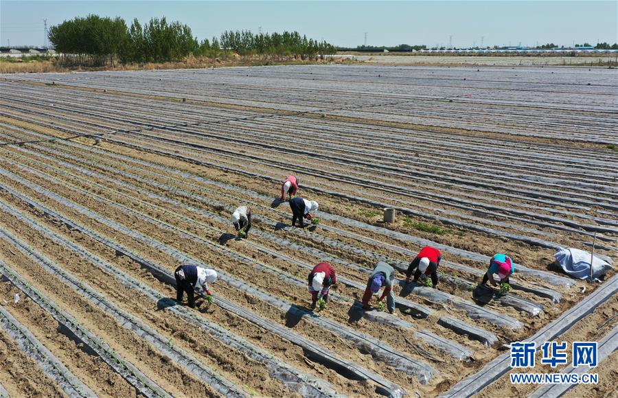 4月25日,灤南縣東黃坨鎮新戶村農民在田間栽植煙薯秧苗(無人機照片)。近年來,河北省灤南縣利用當地土壤和氣候特點,引導農民因地制宜發展煙薯種植,取得良好效果。目前該縣煙薯種植面積達3萬多畝,每畝年收入達5000多元。新華社記者楊世堯攝