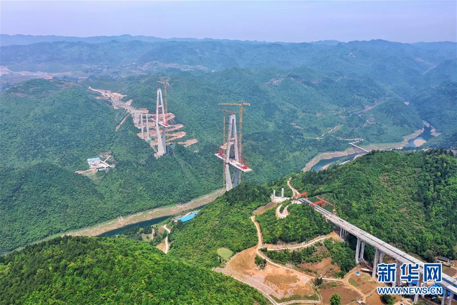 這是建設中的遵余高速湘江大橋(4月26日攝,無人機照片)。近日,由中鐵廣州局承建的貴州遵余高速湘江大橋工程在做好疫情防控的同時,全力恢復生產建設。目前工程進展順利,正在進行主橋鋼梁架設,預計將于8月底合龍。據了解,遵余高速湘江大橋橋梁全長1700余米,主跨560米。新華社記者劉續攝
