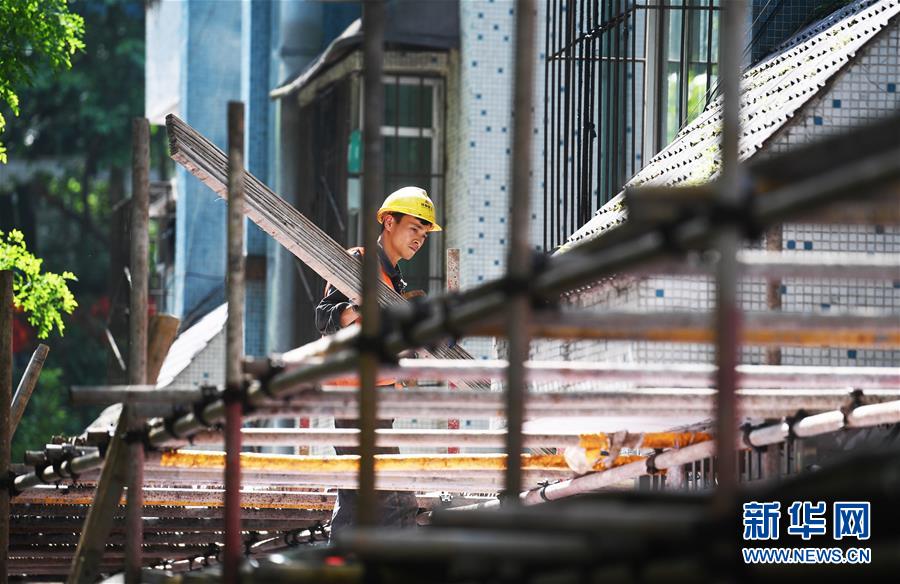 4月26日,工人在渝中區大溪溝街道雙鋼路社區改造提升項目施工現場作業。近段時間以來,重慶市渝中區大溪溝街道加快推進轄區內老舊小區改造提升工作,從環境衛生、房屋管理及養護、安防及車輛管理、綠化管理等方面進行綜合改造提升,以增強社區居民的幸福感、獲得感、安全感。新華社記者王全超攝