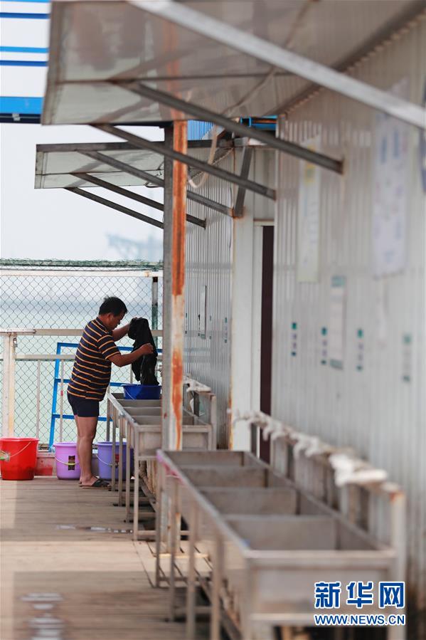 4月25日,一名工人在海上生活區洗衣服。新華社記者盧燁攝