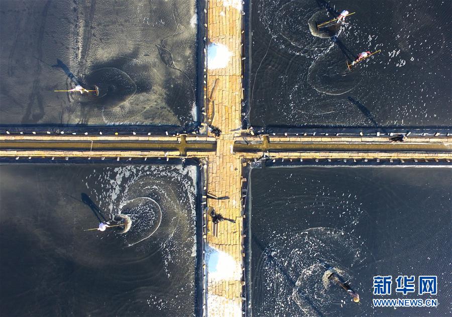 4月27日,莆田鹽場(chǎng)的工人在曬鹽池里忙碌(無人機(jī)照片)。莆田鹽場(chǎng)位于福建省莆田市秀嶼區(qū)東嶠鎮(zhèn),辛勤勞作的鹽工、縱橫交錯(cuò)的曬鹽池,共同構(gòu)成如畫的風(fēng)景。新華社記者魏培全攝