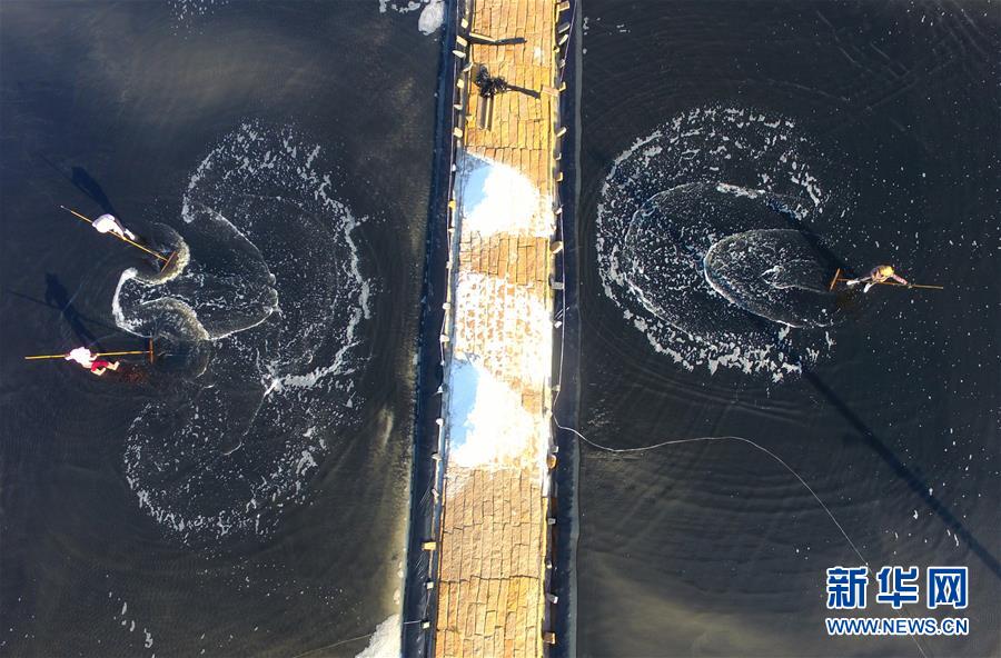 4月27日,莆田鹽場的工人在曬鹽池里忙碌(無人機照片)。莆田鹽場位于福建省莆田市秀嶼區東嶠鎮,辛勤勞作的鹽工、縱橫交錯的曬鹽池,共同構成如畫的風景。新華社記者魏培全攝
