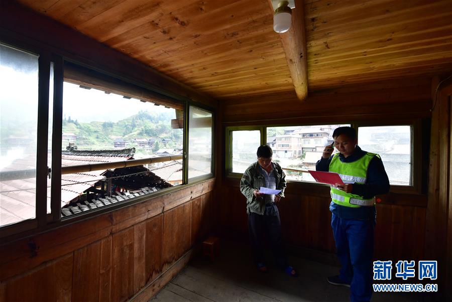 李義成(左)在巡寨了解防火情況(4月27日攝)。新華社記者黃孝邦攝