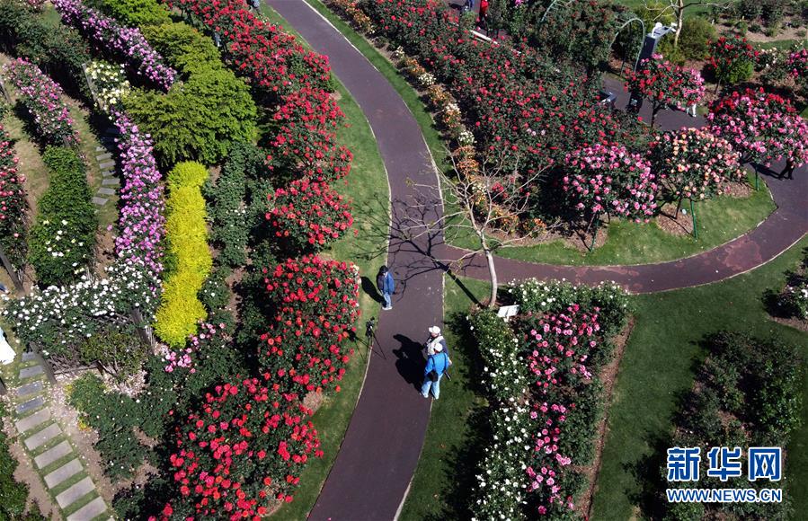 4月28日,游人在上海辰山植物園的月季島上賞花(無人機(jī)照片)。近日,上海迎來月季花期,上海辰山植物園的月季島上,各色月季競相綻放,形成絢爛花海。新華社記者劉穎攝