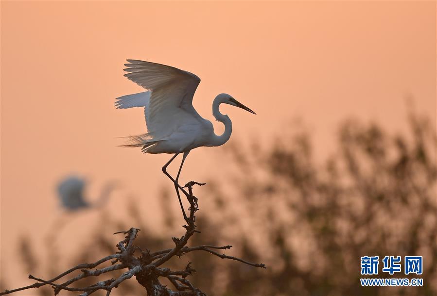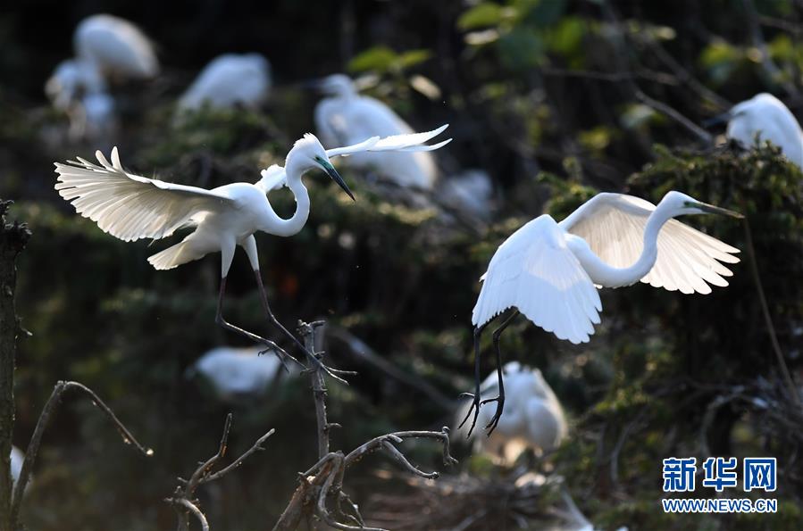 白鷺在位于鄱陽湖畔的南昌市象山森林公園內棲息(4月27日攝)。近日,在江西省南昌市新建區象山森林公園內,已安家筑巢的大批白鷺進入繁殖旺季。在夕陽的照耀下,白鷺時而翩翩起舞,時而展翅盤旋,構成一幅美麗的自然生態畫卷。新華社記者萬象攝