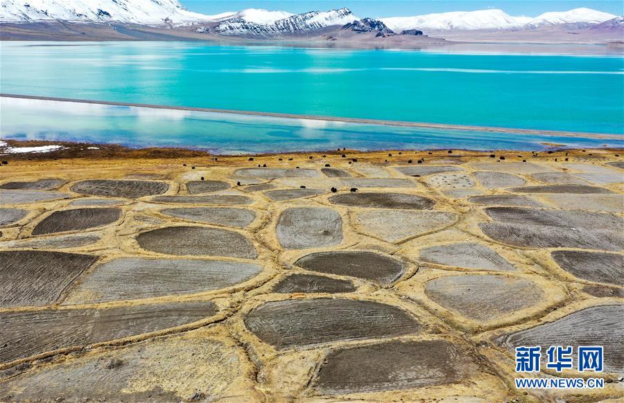 這是4月30日拍攝的當穹錯湖畔的農田(無人機照片)。當穹錯地處西藏那曲市尼瑪縣南部,湖面海拔4475米。暮春時節,湖水碧藍清亮,讓人仿佛置身仙境。新華社記者田金文攝