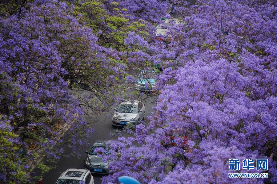 這是5月2日在昆明市教場中路拍攝的藍花楹。近日,云南省昆明市部分街區的藍花楹競相開放,為春城增添靚麗風景。新華社記者胡超攝