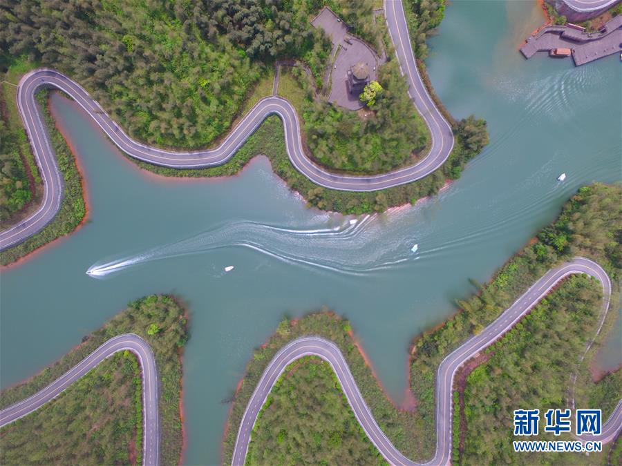 5月1日,在貴州省赤水市竹海國家森林公園里,游客乘坐快艇游覽竹海湖(無人機照片)?!拔逡弧奔偃掌陂g,人們以多種方式放松心情、享受假日。新華社發(張鵬攝)