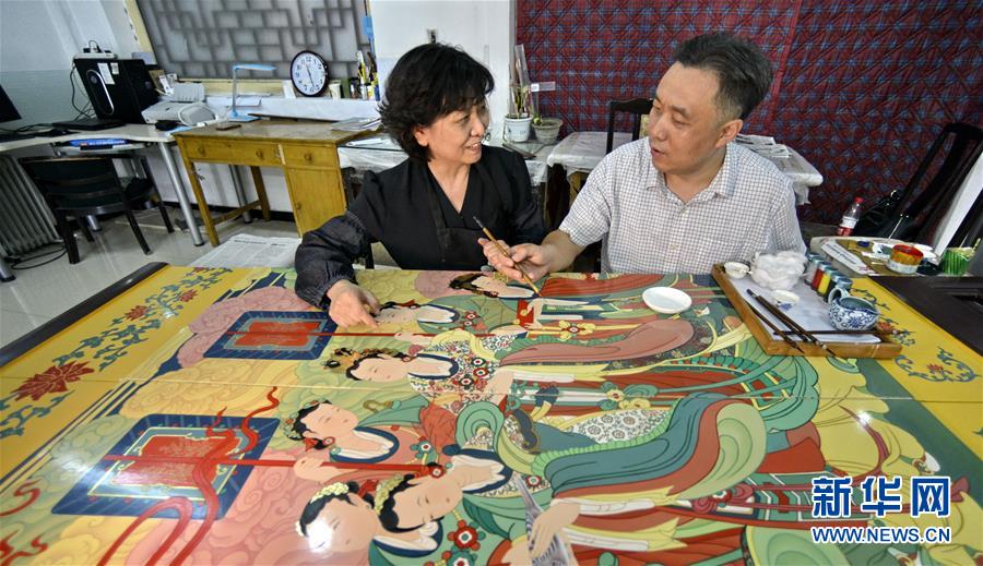 5月4日,屏風設計人、國家級非物質文化遺產“金漆鑲嵌髹飾技藝”代表性傳承人柏群(右)和領銜主創的工藝美術大師胡昕進行屏風畫面的最后檢視。新華社記者 李欣 攝