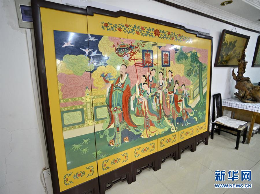 5月4日拍攝的采用金漆鑲嵌彩繪工藝繪制完成的承恩寺壁畫屏風《帝后放飛圖》。新華社記者 李欣 攝