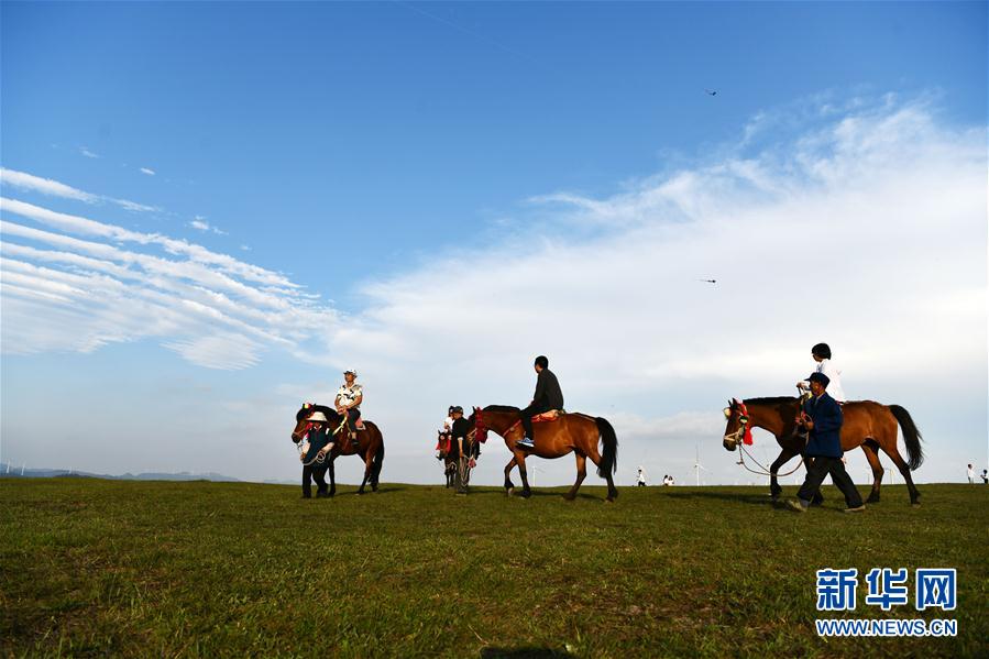 5月3日,游客在貴州省龍里大草原景區騎馬觀光。“五一”小長假期間,貴州省黔南布依族苗族自治州龍里大草原景區天氣怡人,高山草原風光吸引游客前來游玩。新華社記者 楊文斌 攝