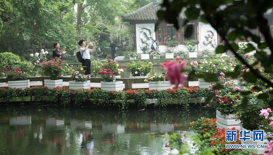 5月5日,游客在西湖畔的郭莊觀看月季花展。“五一”期間,第八屆杭州西湖月季花精品展在杭州西子湖畔舉行,展出國(guó)內(nèi)外700余個(gè)月季品種。新華社記者翁忻旸攝