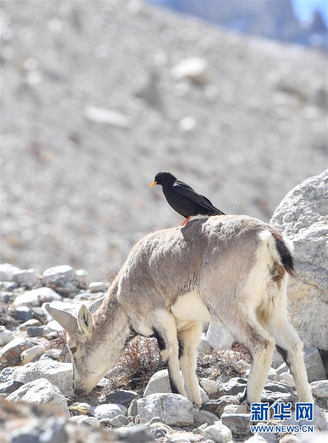 一只黃嘴山鴉停留在巖羊身上(5月8日攝)。當(dāng)日,一群巖羊在珠峰大本營周圍覓食,黃嘴山鴉飛到巖羊身上停留,構(gòu)成一幅幅生動有趣的雪域圖畫。新華社記者晉美多吉攝