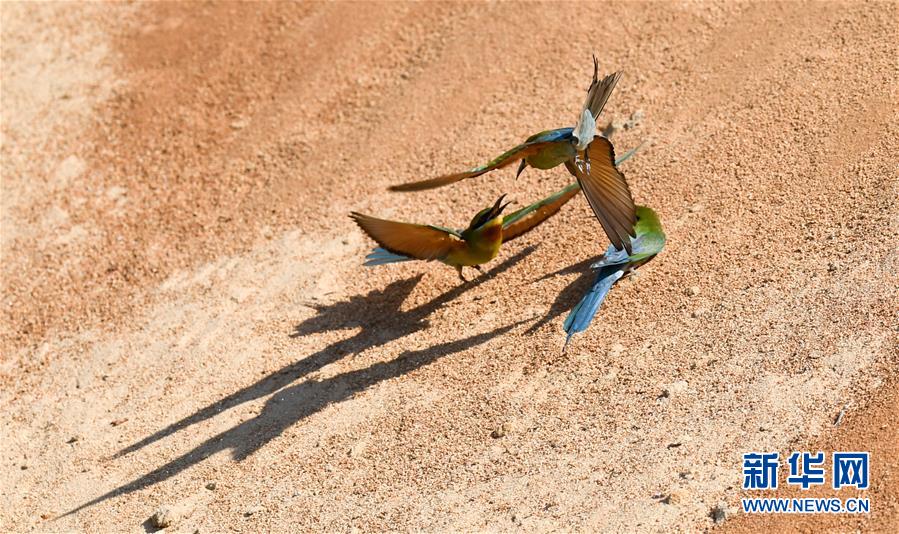 在海口五源河下游蜂虎保護(hù)小區(qū),栗喉蜂虎在嬉戲(5月7日攝)。新華社記者楊冠宇攝