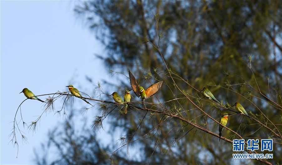 在海口五源河下游蜂虎保護小區,栗喉蜂虎在樹枝上休息(5月7日攝)。新華社記者楊冠宇攝