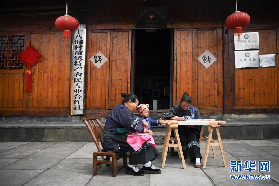 吳美金(右一)在十八洞村苗繡特產農民專業合作社繡苗繡(4月24日攝)。1967年出生的吳美金,1992年嫁入飛蟲村(現十八洞村飛蟲寨)時,只有爛泥路的飛蟲村不僅田土少,掙錢活路也少,生活十分困難。2014年,吳美金加入了十八洞村苗繡特產農民專業合作社,從小就會的苗繡傳統手藝如今成了家庭增收的法寶,不僅在家門口就把錢掙了,同時還能照顧年幼的孫子孫女。“現在的日子,比年輕的時候好多了?!眳敲澜鹫f。新華社記者薛宇舸攝