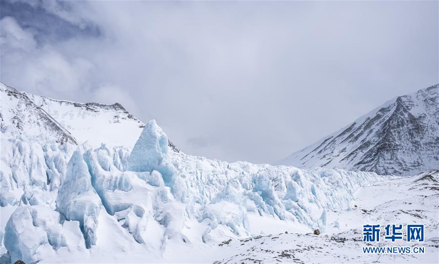 珠峰海拔5800米至海拔6500米的冰塔林(5月9日攝)。從海拔5800米的珠峰過渡營地到海拔6500米的前進營地,冰塔林沿山谷排列,蔚為壯觀。新華社記者孫非攝