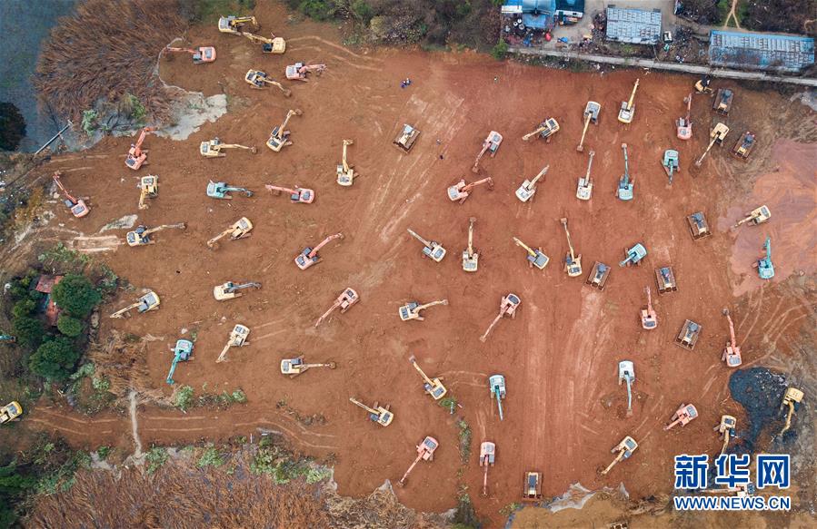 大型機械在武漢火神山醫院建設工地施工(1月24日攝,無人機照片)。新華社記者肖藝九攝