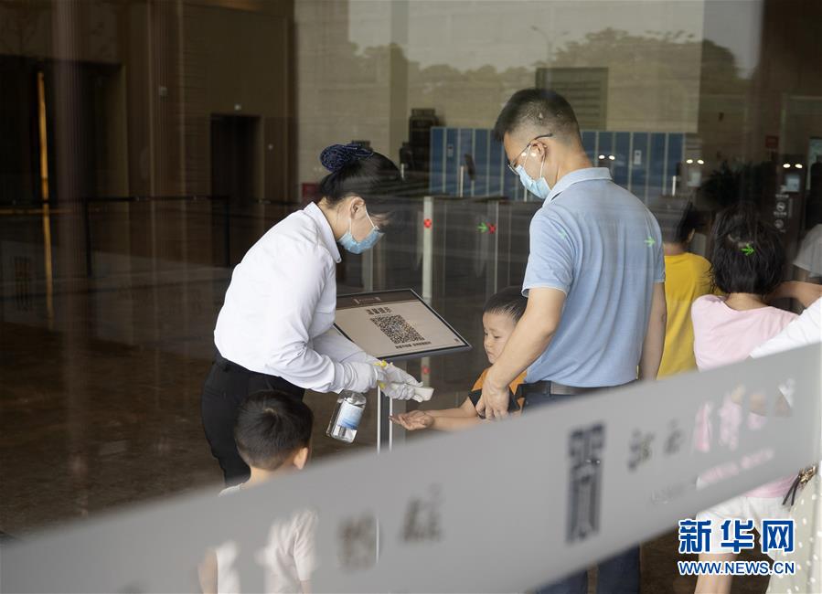 5月17日,在江西省博物館新館,參觀者入館前測量體溫。江西省博物館新館在做好疫情防控的前提下有序開放,公眾可通過網上預約參觀游覽。新華社記者張浩波攝