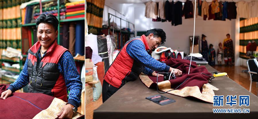 拼版照片:左圖為西藏昌都市江達縣字嘎鄉塔字村村民扎西江措;右圖為扎西江措在西藏昌都市江達縣格桑花民族服飾加工銷售公司制作藏裝。扎西江措學習藏裝縫制不到兩年時間,已經是一名熟練的制衣工,現在月收入4000多元。在此之前,扎西江措靠放牧、四處打零工養活一家人(4月30日攝)。新華社記者詹彥攝