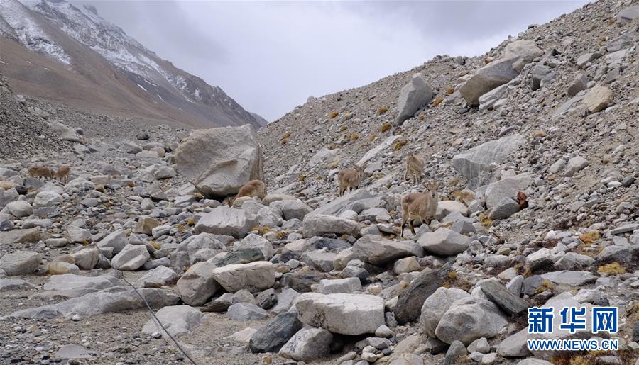 前往海拔5800米珠峰過(guò)渡營(yíng)地路上的巖羊(5月19日攝)。新華社記者晉美多吉攝