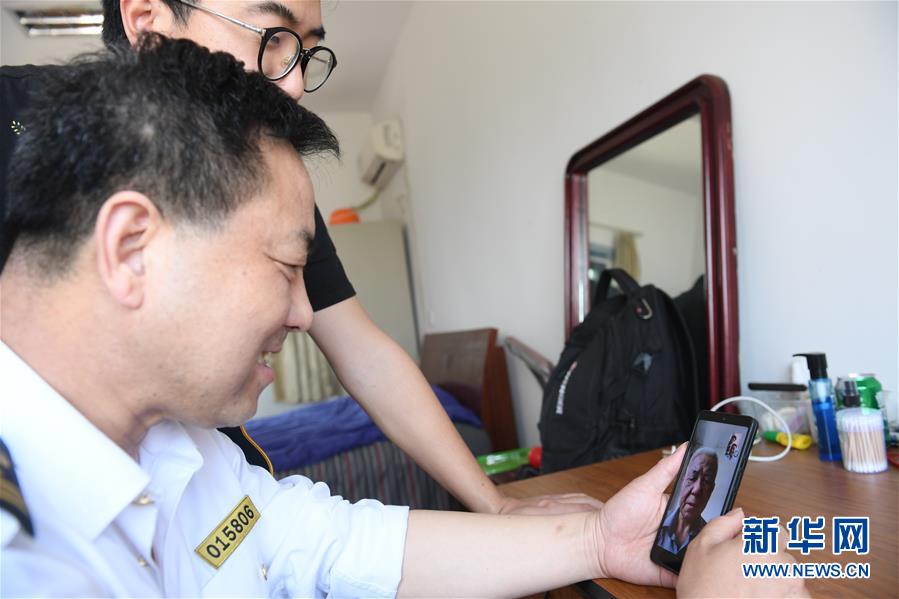 5月20日,在寧波七里嶼,前來運送物資的葉家第四代燈塔工葉靜虎(前)和兒子葉超群在宿舍內跟第三代燈塔工葉中央視頻通話。葉超群自2013年起在七里嶼燈塔工作,葉靜虎從燈塔工崗位上退下來后,目前在寧波航標處后勤事務中心工作。新華社記者翁忻旸攝