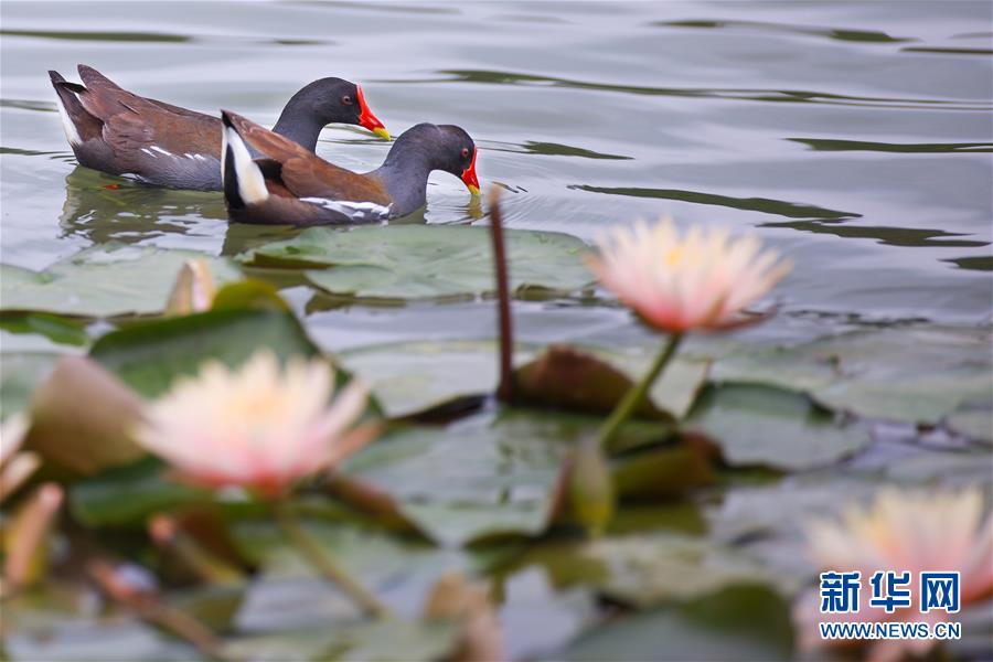 5月22日,兩只紅嘴水雞在蓮葉間游弋。近日,貴陽市觀山湖公園內大片盛開的蓮花吸引了不少水鳥在其間嬉戲覓食。新華社記者劉續攝