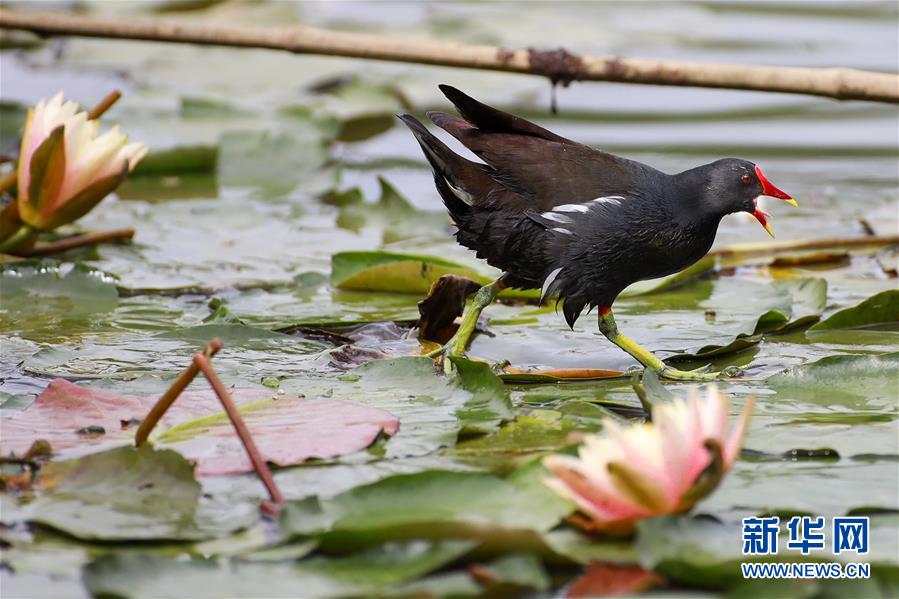 5月22日,一只紅嘴水雞在蓮葉間游弋。近日,貴陽市觀山湖公園內大片盛開的蓮花吸引了不少水鳥在其間嬉戲覓食。新華社記者劉續攝