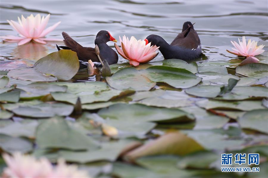 5月22日,兩只紅嘴水雞在蓮葉間覓食。近日,貴陽市觀山湖公園內大片盛開的蓮花吸引了不少水鳥在其間嬉戲覓食。新華社記者劉續攝